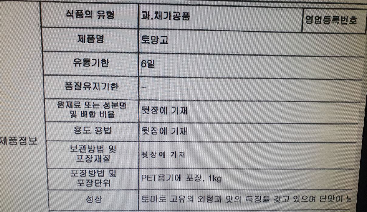 식품첨가물 품목제조보고서를 보면 식품의 유형이 과, 채 가공품으로 등록되어 있고 유통기한도 6일로 명시되어 있습니다. 일반 과일, 채소는 생물로 유통기한이 따로 없지만 토망고의 경우는 제조, 가공과정을 거치기에 유통기한이 설정됩니다. 제조 가공공정을 보면 효소처리 스테비아와 수크랄로스 소량을 희석한 물에 토마토를 침지하여 가공 처리하는 것으로 되어 있습니다. 이는 토마토에 인위적인 가공처리를 하기 때문에 과, 채 가공품으로 분류됩니다.