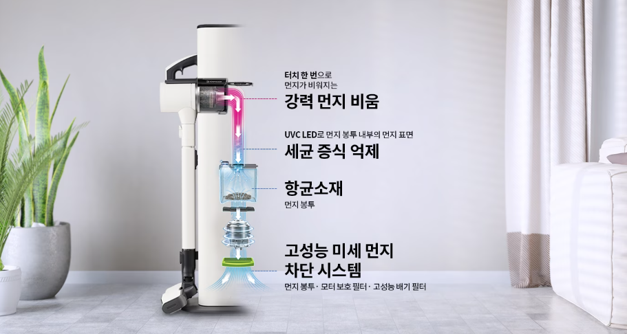 - 5단계 미세먼지 차단 시스템: 청소기 내부로 들어온 미세먼지를 효과적으로 차단하여, 깨끗한 실내 공기를 유지합니다.