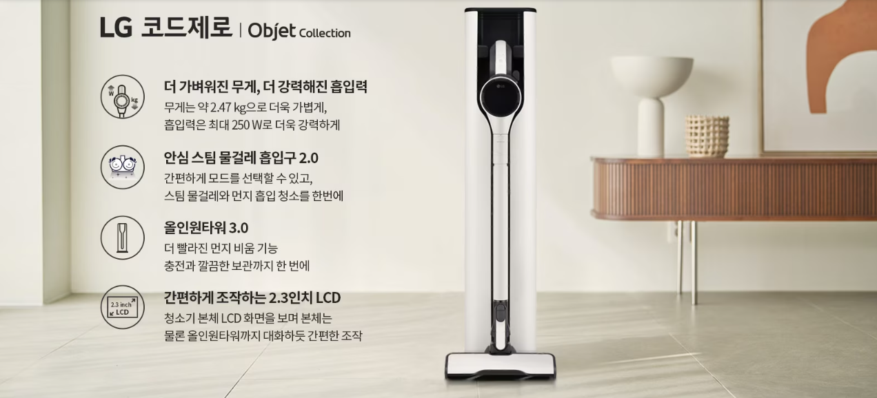 LG 코드제로 오브제컬렉션 A9S는 단순한 청소를 넘어, 우리의 생활을 더 건강하고, 더 편리하며, 더 아름답게 만들어주는 진정한 생활 혁신 제품입니다. 이 제품 하나로 청소의 질이 달라지며, 삶의 질까지 향상됩니다. 튼튼한 내구성, 뛰어난 성능, 그리고 사용자 친화적인 디자인으로, 진정한 삶의 변화를 경험하고 싶다면 이 제품을 선택해보세요. ● LG 코드제로 오브제컬렉션 A9S 가격 알아보기