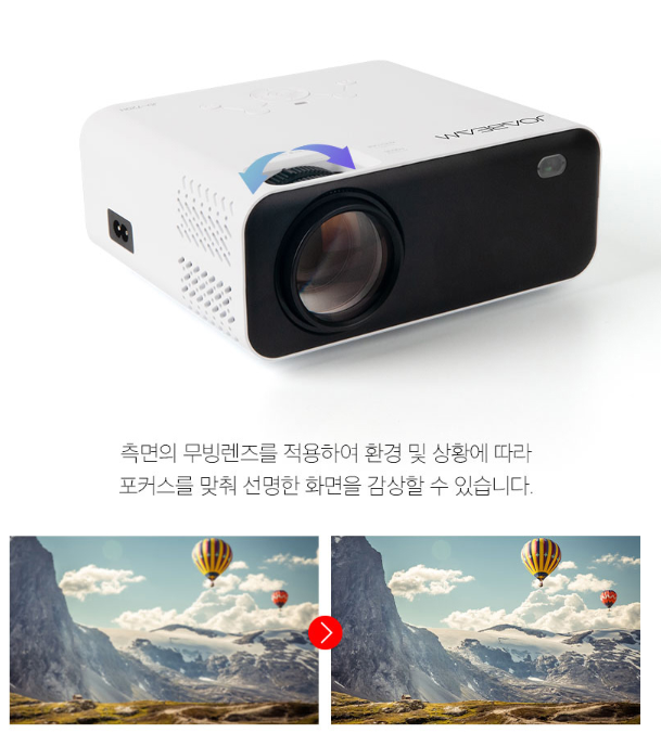 "저가 프로젝터임을 감안하면, 이 가격에 이정도 화질이면 정말 가성비 굿입니다. 물론, 영화관처럼 완벽한 화질을 기대하시면 안 되지만, 집에서 큰 화면으로 영상물을 즐기고 싶은 분들에게는 충분히 만족스러운 선택이 될 거예요. 경사각과 초점 교정 기능이 있어, 미세한 조절이 가능합니다. 약 5~10%의 오차는 잡아줄 수 있으니, 큰 화면을 원하시는 분들도 참고하세요."