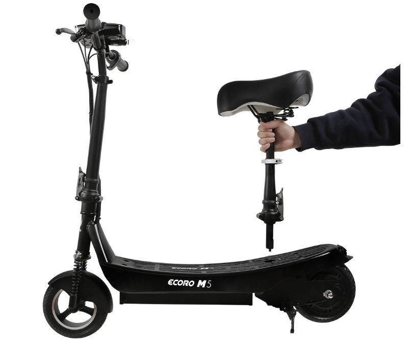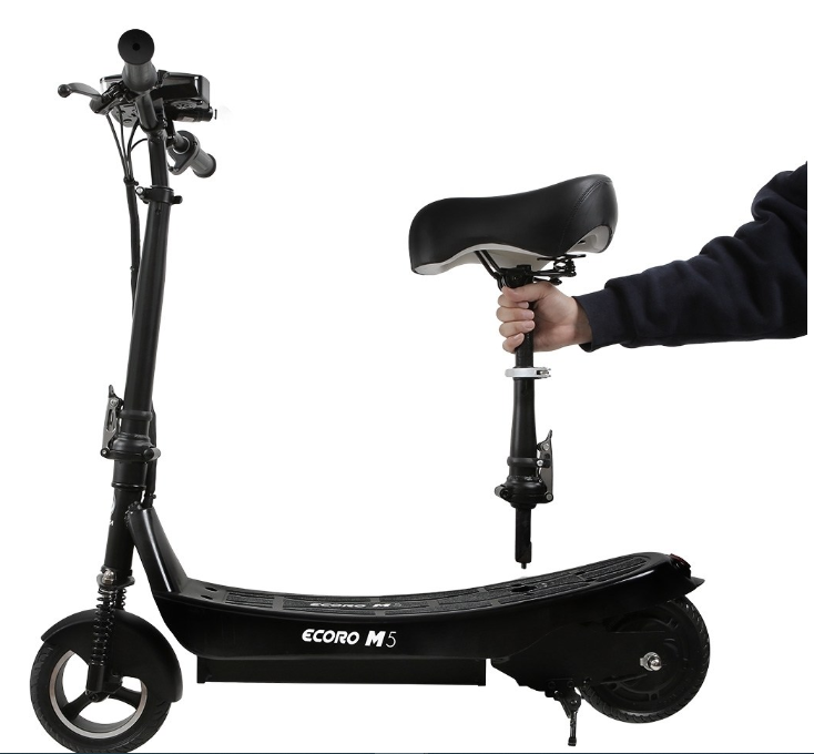 에코로 M5 전동스쿠터의 안장은 사용자의 편의에 따라 쉽게 장착하거나 제거할 수 있습니다. 이는 스쿠터와 킥보드 간의 변환을 간편하게 하여 사용자가 상황에 맞게 이동 수단을 선택할 수 있게 합니다.