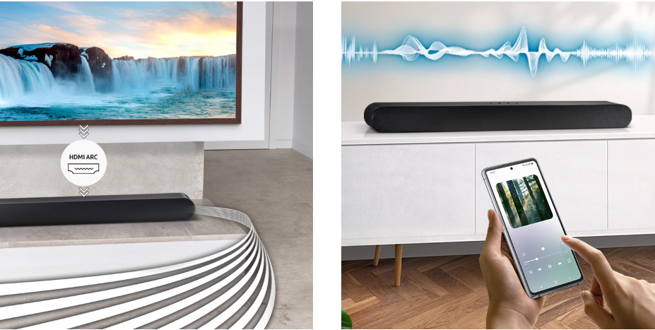 - HDMI ARC: HDMI ARC를 지원하여, 쉽게 TV와 연결하여 사용할 수 있습니다. ●삼성전자 5.0 채널 사운드바 특징에 대해 더 알아보기