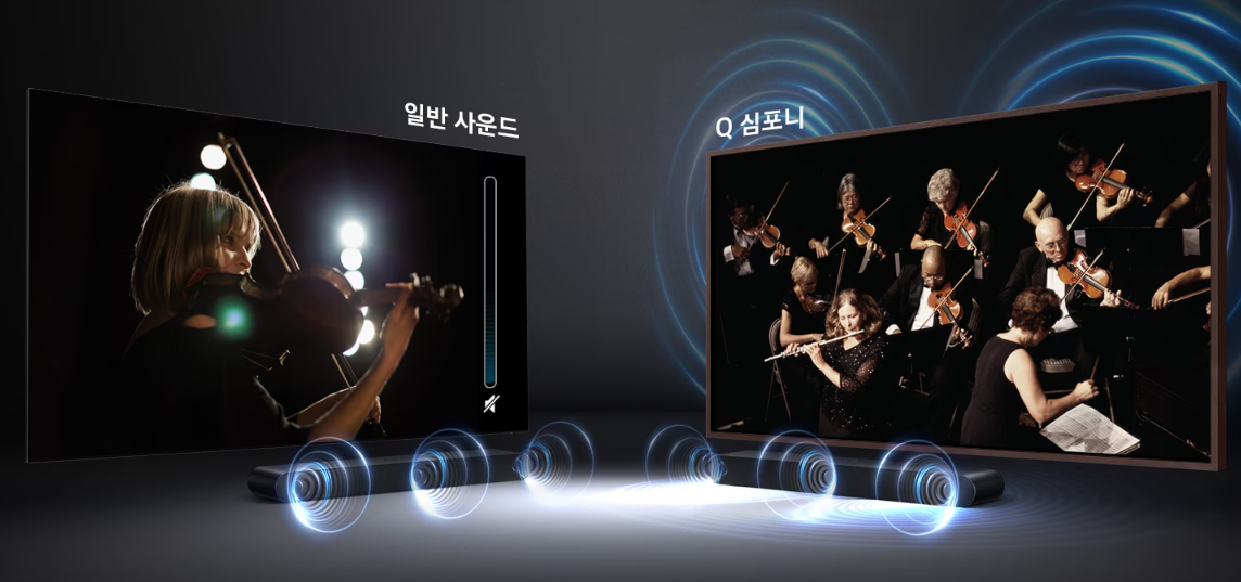 - Q 심포니: 삼성 TV와 완벽하게 동기화되어, TV의 음향과 사운드바가 함께 조화를 이루며 더욱 강화된 사운드를 만듭니다.