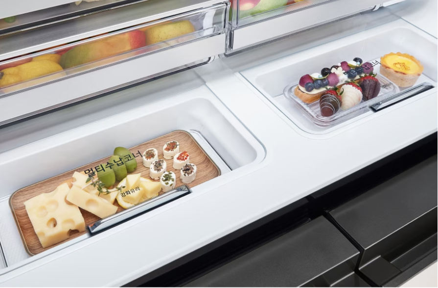 LG 디오스 오브제컬렉션 냉장고의 멀티수납코너는 정말 마음에 드는 기능이에요. 작지만 소중한 이 공간 덕분에 다양한 음식을 깔끔하게 보관할 수 있죠. 이 작은 구석을 활용해서 스낵이나 소스, 작은 병들을 정리하면 냉장고 안이 훨씬 더 넓고 깔끔해 보여요.