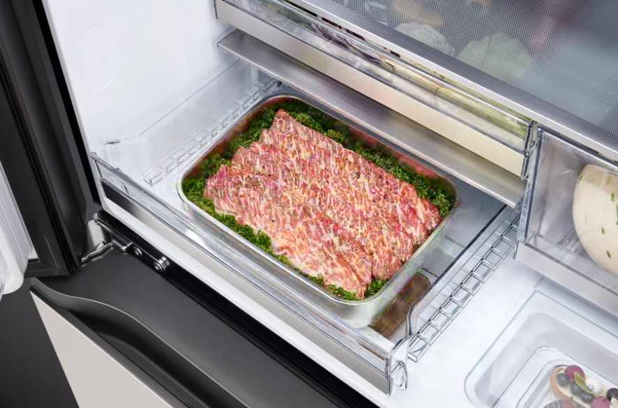 신선맞춤실을 설정하면, 모드에 따라 대략 -2.5℃에서 3℃ 사이의 온도로 설정되니까, 식재료마다 최적의 신선함을 유지할 수 있어요. 그리고 냉장실 온도를 2℃로 설정하면 야채 샐러드, 요거트, 밀키트는 냉장실 온도에 맞춰져서 조절되고, 1℃로 설정하면 펫 식품까지 냉장실 온도를 따라가니까, 설정만 잘 해두면 나머지는 냉장고가 알아서 척척!