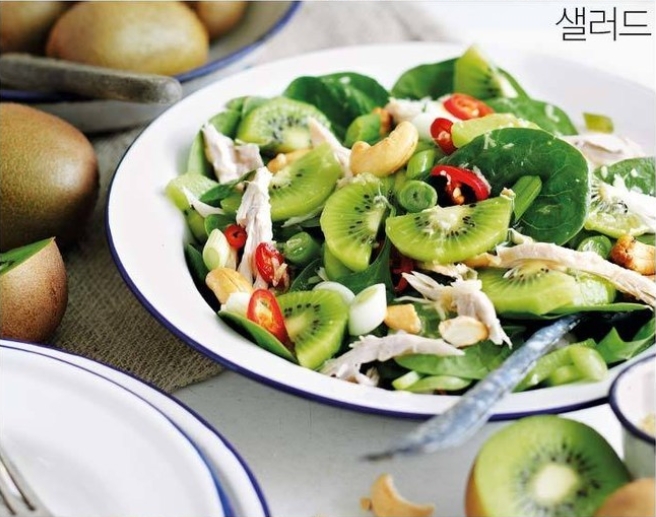 키위는 100g 당 55 kcal로 칼로리가 낮고 사과보다 3배 이상 많은 식이섬유가 지방이 체내에 쌓이는 것을 막아 주기 때문에 다이어트에 효과적인 식품입니다. 특히 키위 껍질에는 알맹이보다 여러 영양 성분을 비롯하여 섬유질이 50% 이상, 엽산은 30% 이상 더 많이 함유하고 있기 때문에 잔털을 긁어낸 후 흐르는 물에 씻어 껍질째 먹는 것이 영양적으로도 더욱 효과적입니다.