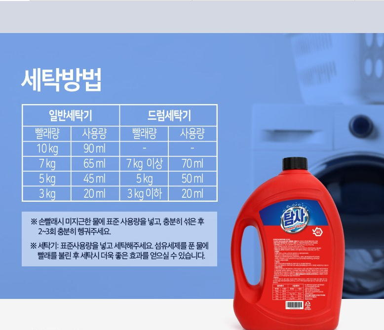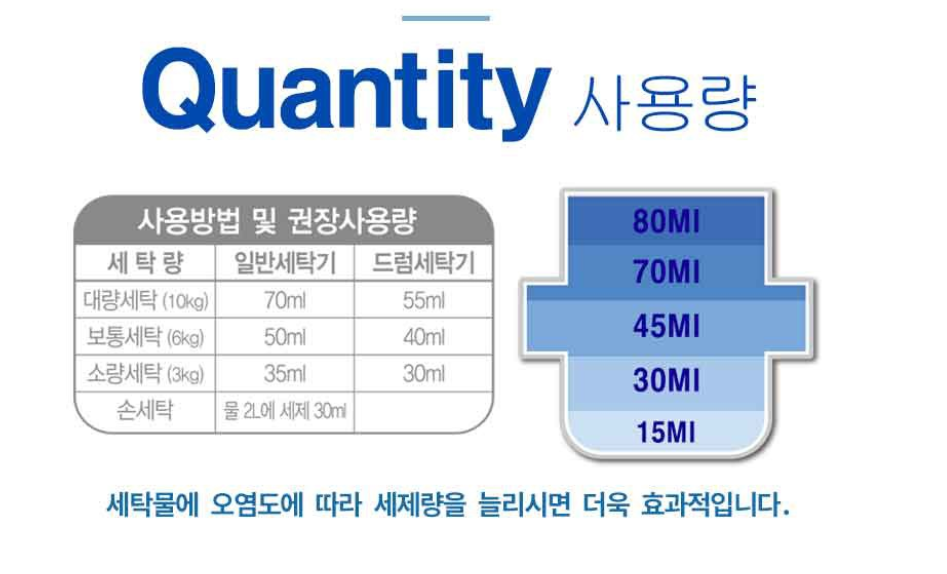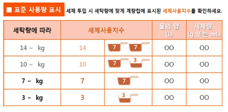 세제 뒤에 보시면 사용량이 적혀 있고 계량컵도 있지만 우리는 이런 깨알같은 글씨를 보기 귀찮아합니다. 하지만 깨끗하고 효율적인 세탁을 위해서는 세제 사용량을 준수하는 것이 중요합니다.
